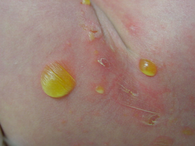 დაავადება შეძლოა გამოვლინდეს კანზე ბუშტუკებისა და ჩირქოვანი პუსტულების ჯგუფებად განლაგებით ან სითხით სავსე დიდი ზომის ბუშტების არსებობით. დაავადებას ახასიათებს ქავილი სუსტი ინტენსივობის ტკივილი და დისკომფორტი.
