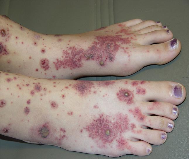 • დაავადება გამოვლინდება მოვარდისფრო ან მოწითალო ლაქების სახით, რომელთა ადგილზეც მალევე წარმოიქმნება კვანძი.