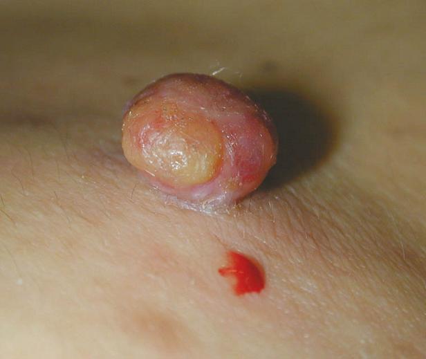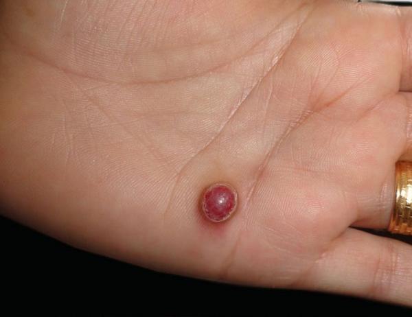 • დაავადება გამოვლინდება მოყვითალო ან მუქი წითელი შეფერილობის მკვრივი კვანძის სახით, რომელიც წამოწეულია კანის ზედაპირიდან.