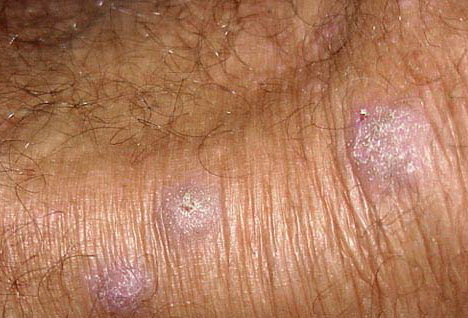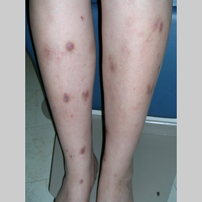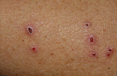 • გამონაყარი წარმოდგენილია პალპაციით მკვრივი, კანის ზედაპირიდან წამოწეული პაპულებით და ნოდულებით, რომელთა ზედაპირი შესაძლოა დაფარული იყოს სისხლიანი ქერქით.