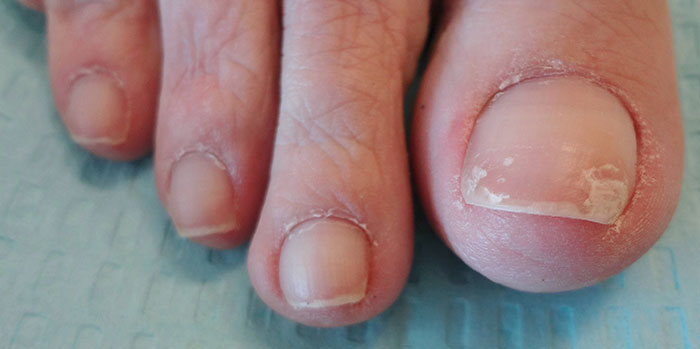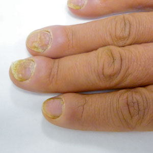 • ონიქომიკოზის დროს ფრჩხილი გასქელებულია, გამოხატულია ფრჩხილქვეშა ჰიპერკერატოზი, ფრჩხილი მოშორებულია საწოლს (ონიქოლიზისი).