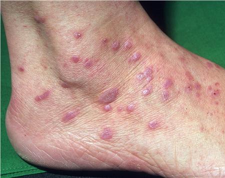 • კვანძოვანი, რომელიც ხშირია მაჯებისა და კოჭების არეში, ასევე გავა- წელის მიდამოში. გამოვლინდება იისფერი შეფერილობის ბრტყელი კვანძების არსებობით, მბრწყინავი ზედაპირით.