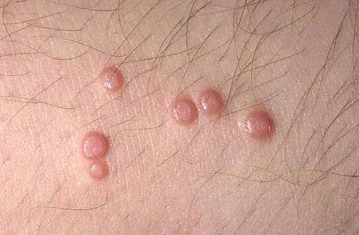 • დაავადება გამოვლინდება კანის ფერის, მცირე ზომის პაპულების გროვებით, შესაძლოა ერთეული გამონაყარიც.