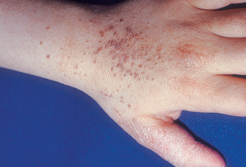• გამოვლინდება ბრტყელი, მოვარდისფრო ან მოყავისფრო შეფერილობის პაპულებით.